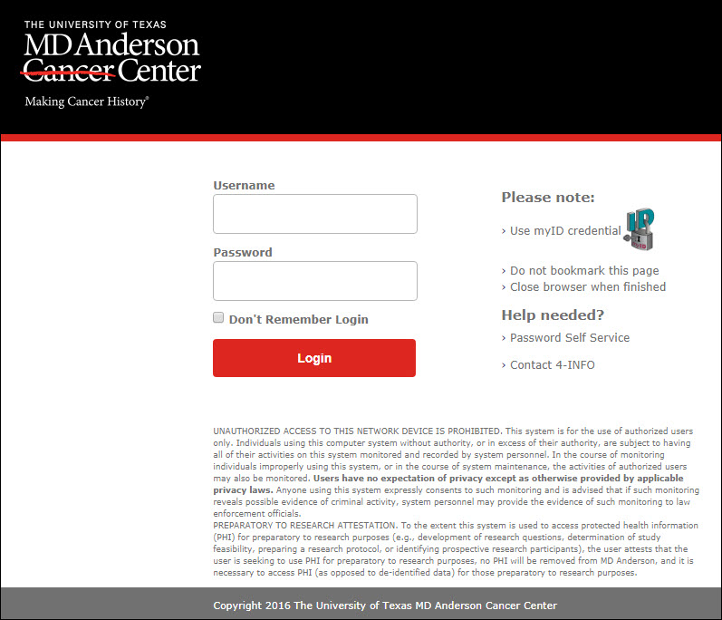 所有MD安德森的教职员工和学生已经建立了帐户。这包括卫生专业学院的学生。您不需要注册一个帐户。您使用您当前的MyID, (Active Directory),用户名和密码登录到这个系统。(这是你登录校园工作站时使用的用户名和密码)。